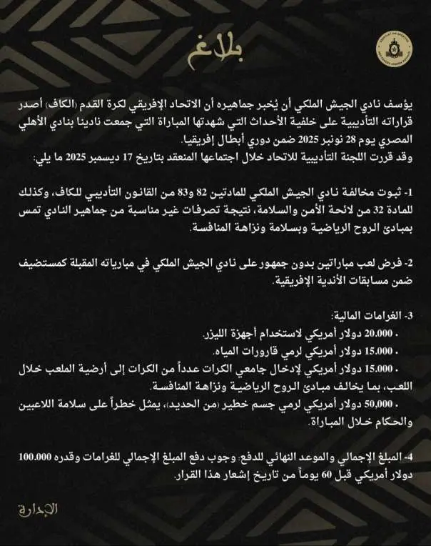 25 ديسمبر, 2025نشر نادي الجيش الملكي المغربي، بيانا رسميا، في أول رد فعل رسمي بعد صدور عقوبات الاتحاد اﻷفريقي لكرة القدم “الكاف”.