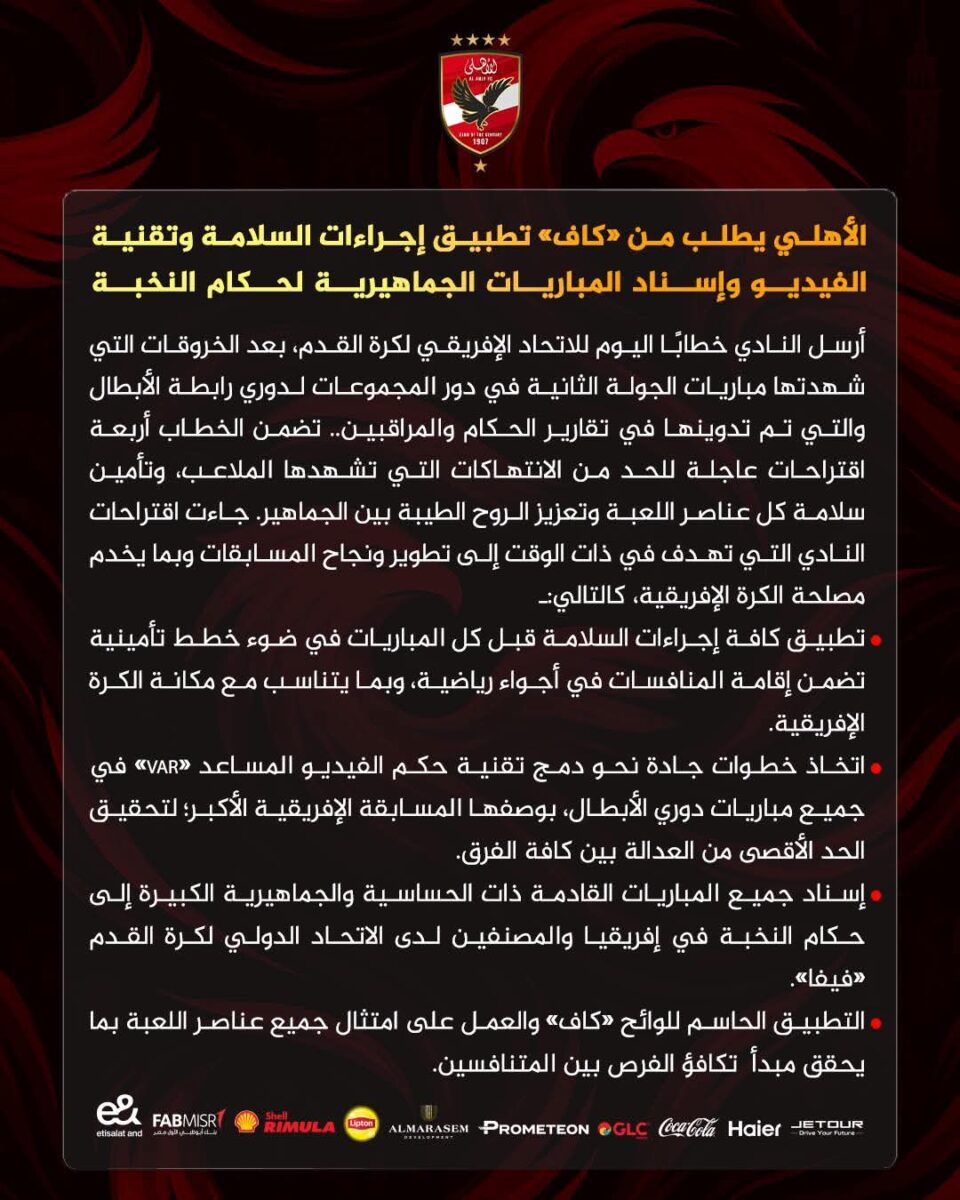 30 نوفمبر, 2025ينفرد “إيكو سبورت” بنشر تفاصيل التقرير الرسمي للحكم الليبي أحمد الشلماني، بشأن مباراة الأهلي المصري ضد الجيش الملكي بدوري أبطال أفريقيا.