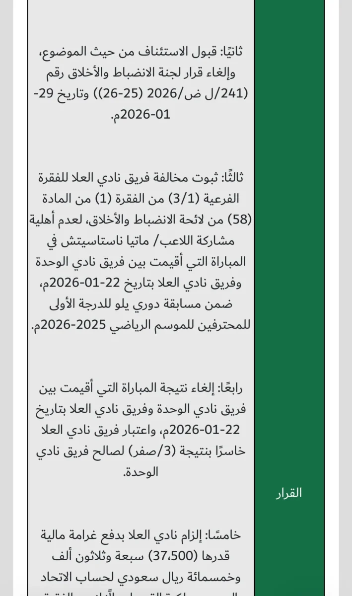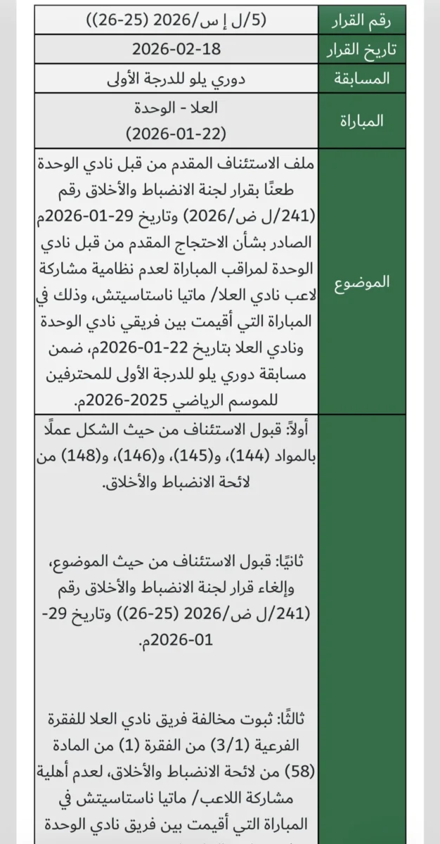 ويتعلق الحكم بالمباراة التي جمعت بمباراة الوحدة والعلا ضمن منافسات دوري يلو للدرجة الأولى للمحترفين للموسم الرياضي 2025-2026، والتي أقيمت بتاريخ 22 يناير 2026.