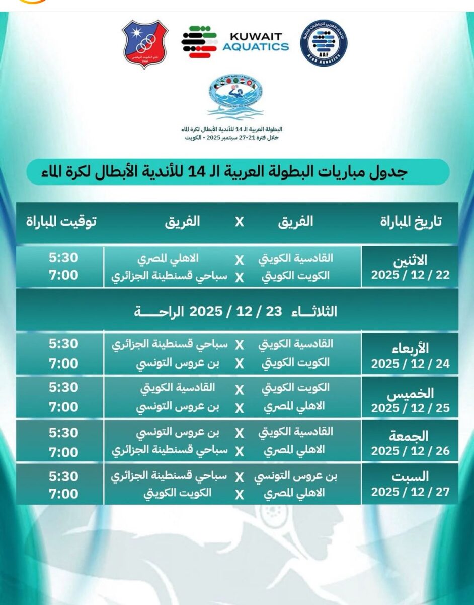 21 ديسمبر, 2025تستضيف الكويت منافسات البطولة العربية الرابعة عشرة للأندية الأبطال لكرة الماء، خلال الفترة من 22 إلى 27 ديسمبر 2025.