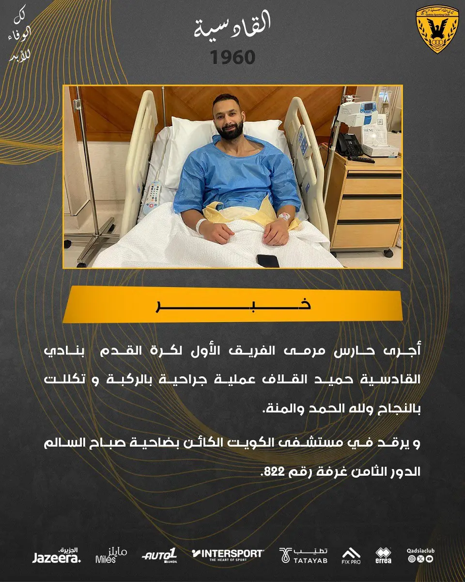 وأجري أمس حارس مرمي نادي القادسية حميد القلاف عملية جراحية في الركبة بعد الإصابة بقطع في الغضروف خلال مباراته أمام العربي.