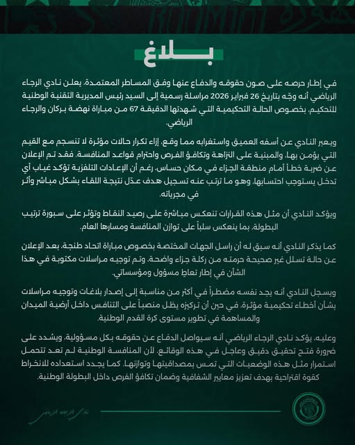 27 فبراير, 2026أصدر نادي الرجاء المغربي بياناً رسمياً أعرب من خلاله عن اعتراض على التحكيم وخاصة في مباراة الفريق ضد نهضة بركان.