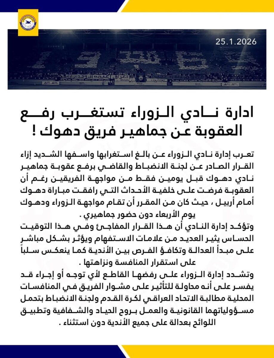 26 يناير, 2026أعربت إدارة نادي الزوراء عن بالغ استغرابها وأسفها الشديد تجاه القرار الصادر عن لجنة الانضباط والقاضي برفع العقوبة عن جماهير نادي دهوك، قبل يومين فقط من مواجهة الفريقين، رغم أن العقوبة كانت مفروضة على خلفية الأحداث التي رافقت مباراة دهوك أمام أربيل.