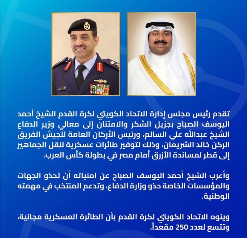 اليوسف يثمّن دعم الدفاع.. تأمين طائرات لجماهير الأزرق في كأس العرب