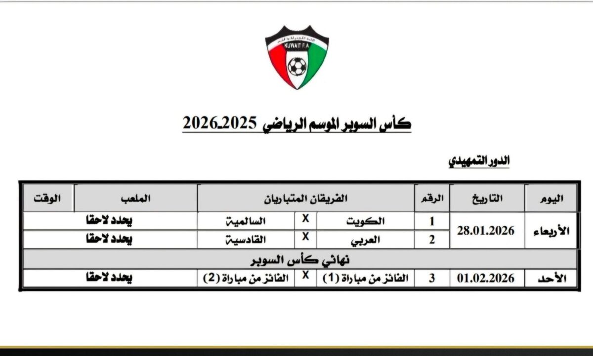 31 ديسمبر, 2025كشف الاتحاد الكويتي لكرة القدم عن جدول مباريات كأس السوبر المحلي خلال الموسم الحالي 2025-2026.