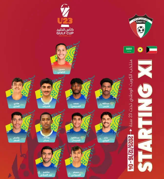 مع العلم أن مباراة الكويت والسعودية في كأس الخليج تحت 23 عاما، تبدأ في الساعة الثالثة إلا الربع ظهر اليوم الاثنين.