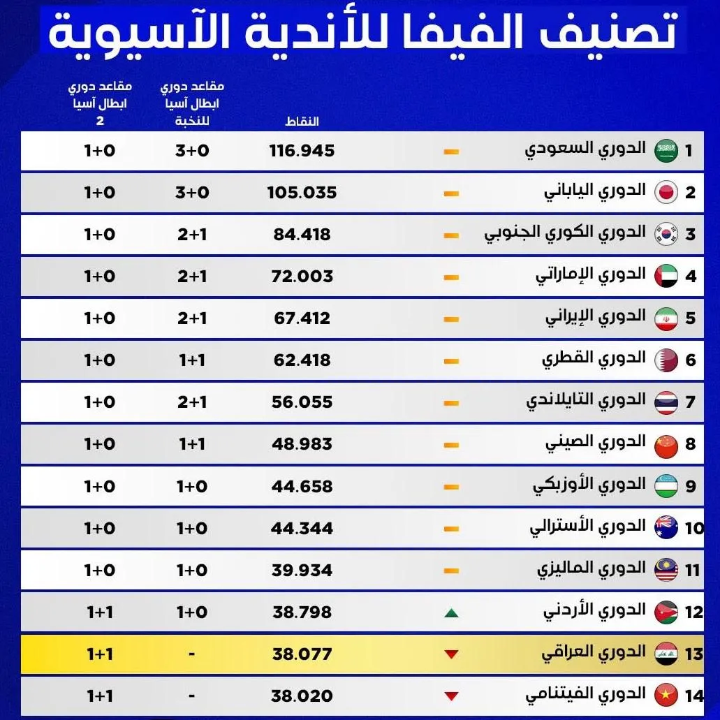 وحافظ الدوري السعودي على المركز الأول في التصنيف، وجاء الدوري الياباني ثانياً، يليه الدوري الكوري الجنوبي في المركز الثالث.