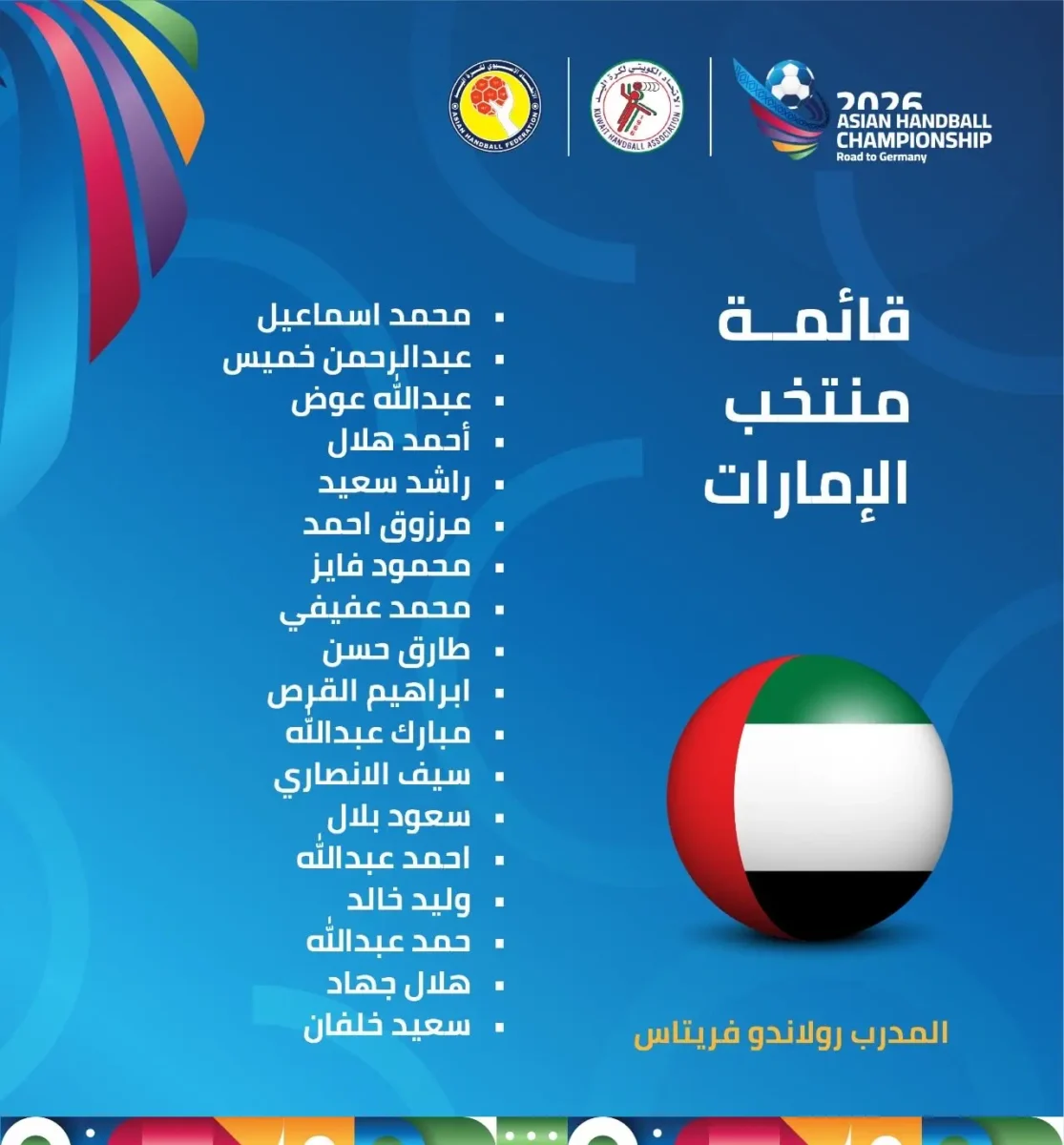 14 يناير, 2026أعلن الاتحاد الإماراتي لكرة اليد عن القائمة النهائية للمنتخب، التي تخوض منافسات البطولة الآسيوية لكرة اليد، التي تستضيفها الكويت خلال الفترة المقبلة.