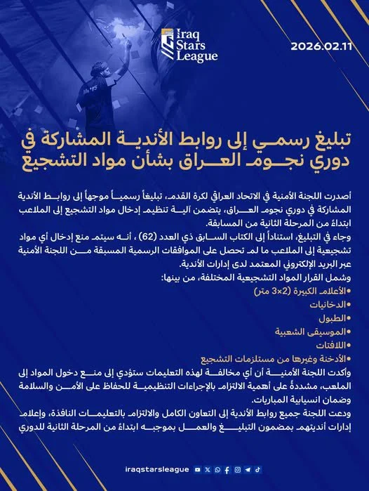 11 فبراير, 2026أصدرت اللجنة الأمنية في الاتحاد العراقي لكرة القدم تعميمًا رسميًا موجّهًا إلى روابط الأندية المشاركة في دوري نجوم العراق.