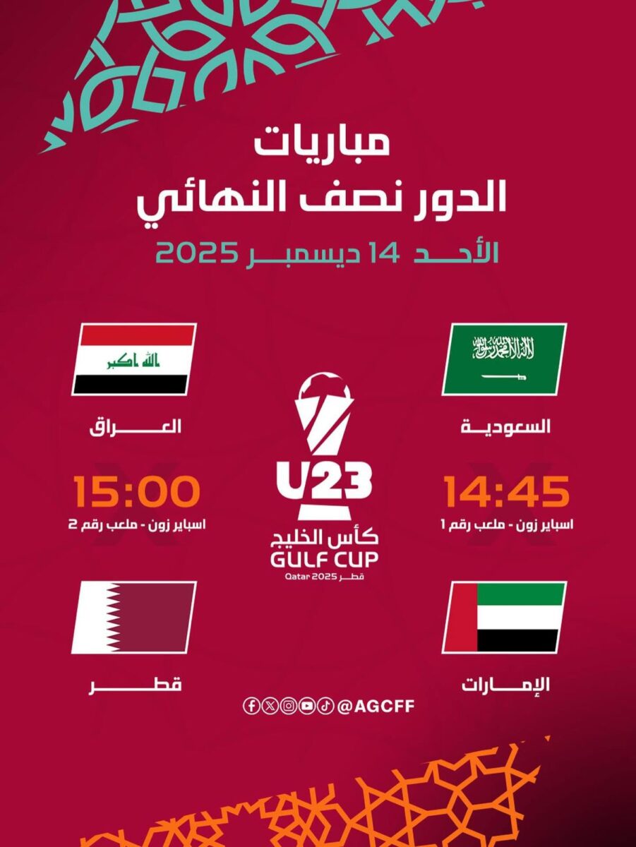 وتأهلت منتخبات: السعودية وقطر والإمارات والعراق لنصف نهائي كأس الخليج تحت 23 عاما.