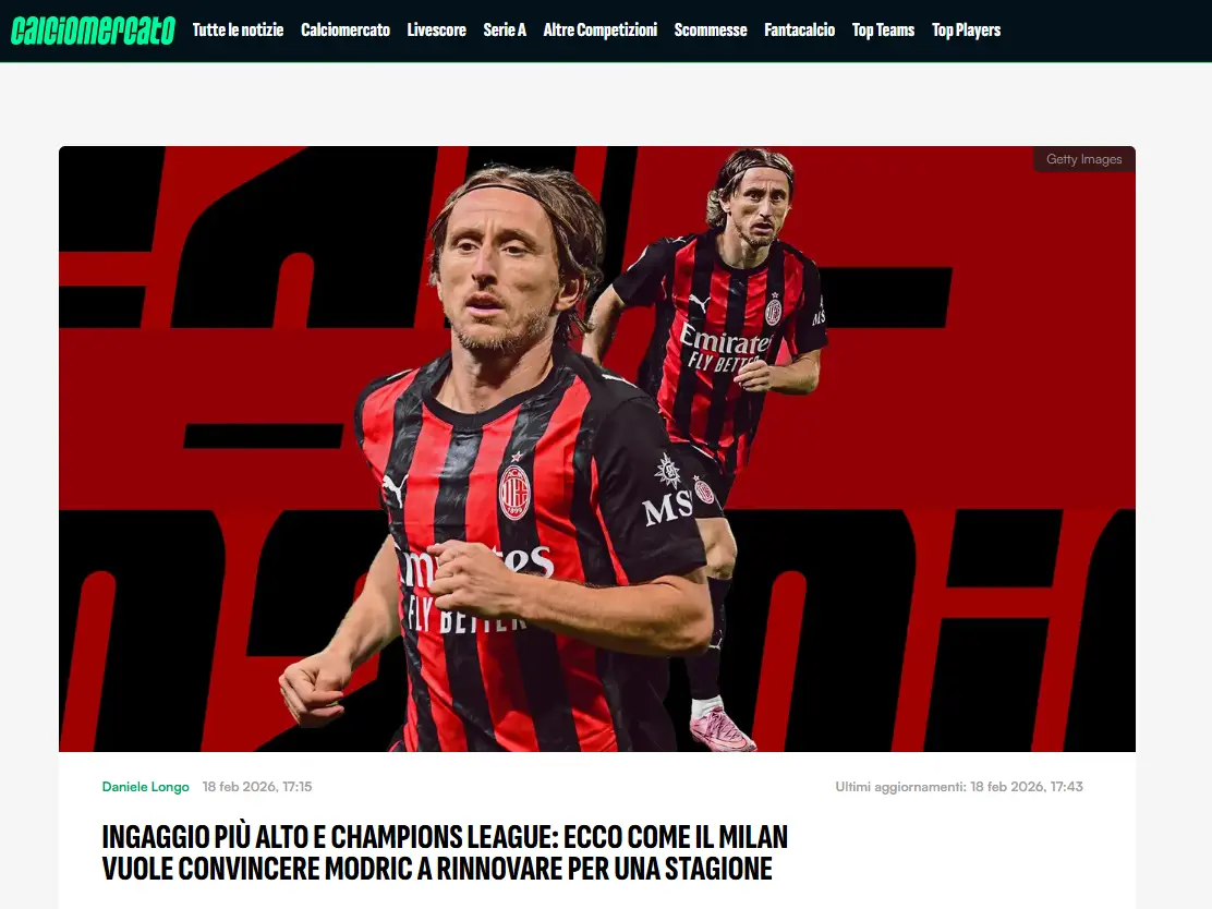 18 فبراير, 2026يتجه نادي ميلان نحو فتح باب المفاوضات مع نجمه الكرواتي لوكا مودريتش من أجل تمديد عقده الذي ينتهي الصيف المقبل، بعد العروض القوية التي قدمها بقميص الروسونيري منذ انضمامه للفريق.
