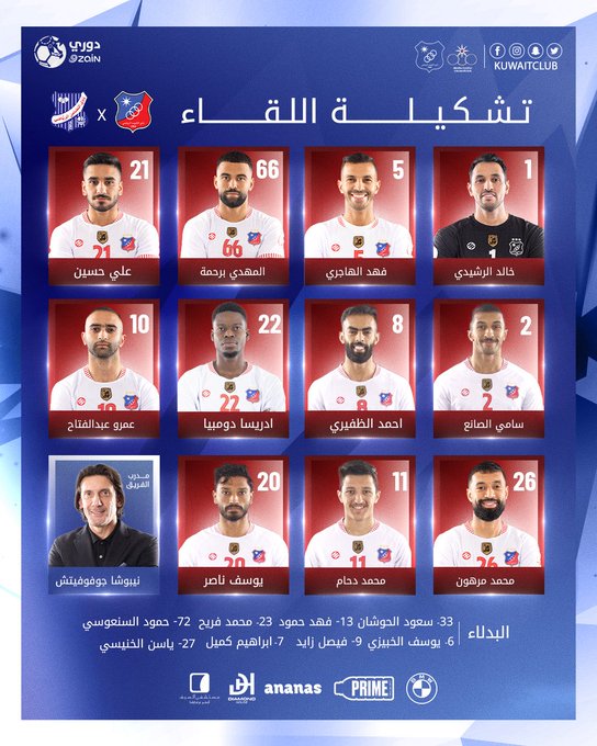 2 يناير, 2026أعلن نيبوشا مدرب نادي الكويت تشكيل فريقه لمواجهة التضامن ضم الجولة العاشرة من دوري زين الكويتي.