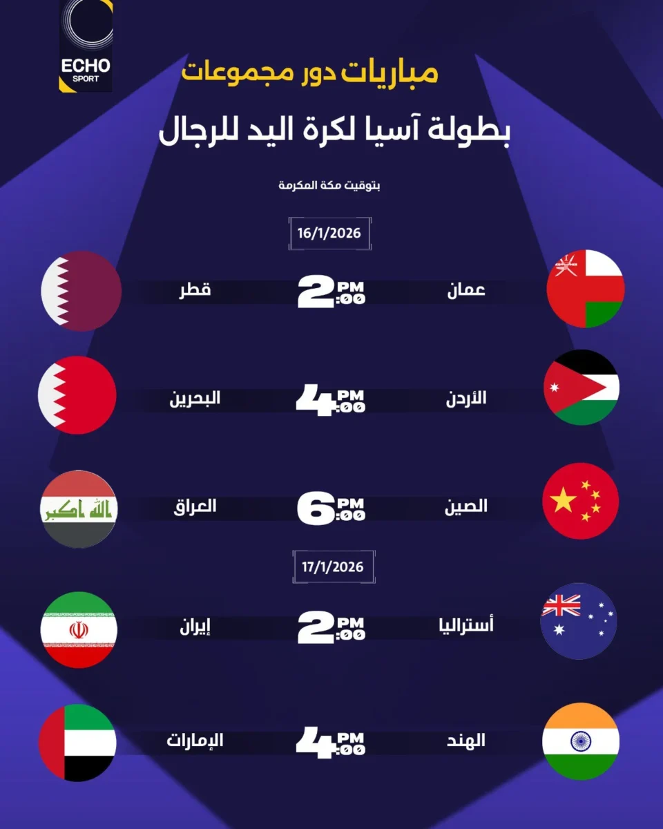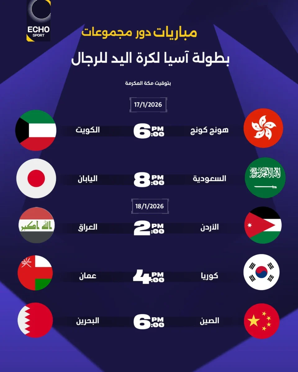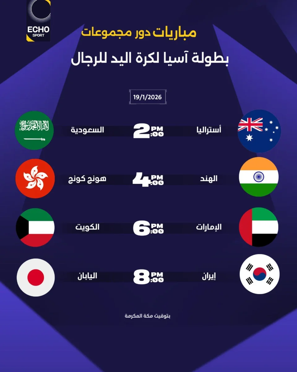 إنفوجراف مواعيد مباريات دور المجموعات لبطولة آسيا لكرة اليد